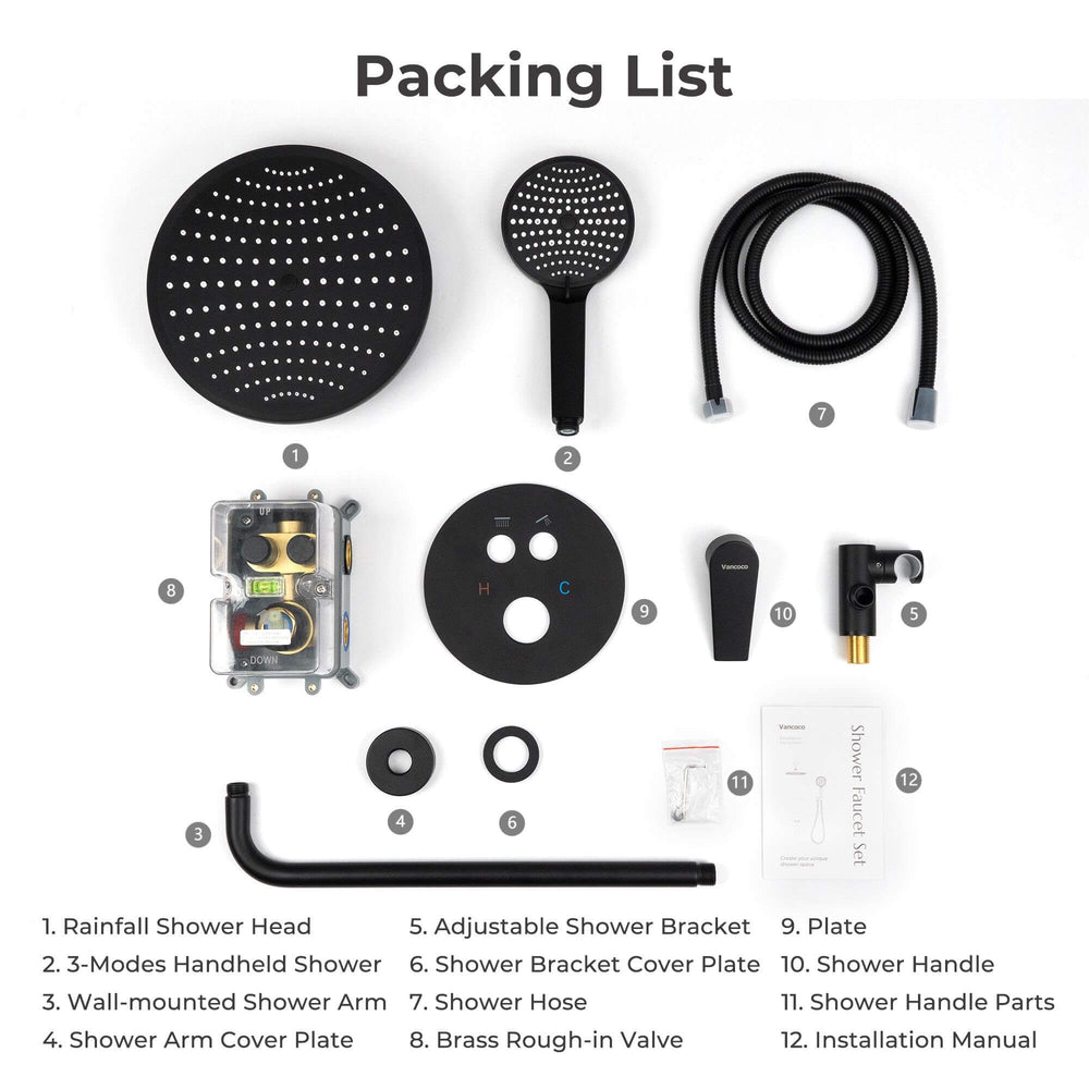 | Included Components | Rough-In Valve, Trim Plate, Diverter, Rain Head, Handheld, Hose, Brass Shower Arm, Mounting Bracket |