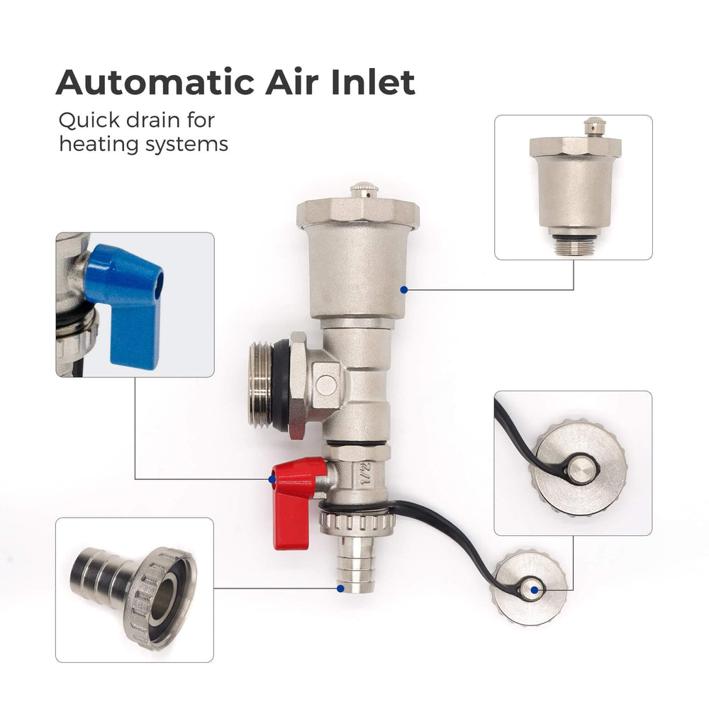 Includes flow meters, temperature control valves, auto air vent, and drain valve with 1/2" adapters for full system control.
