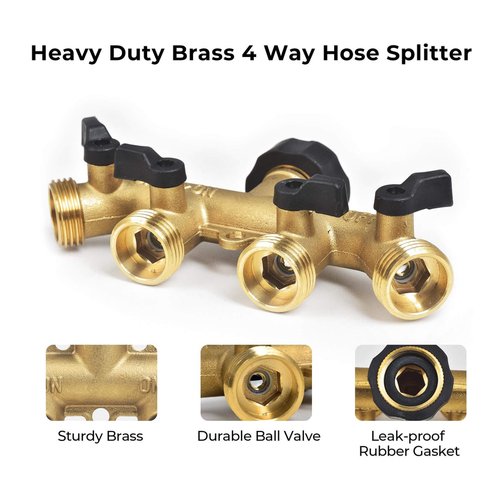 Four independent brass valves with sealed rubber gaskets allow precise control for multiple hoses.
