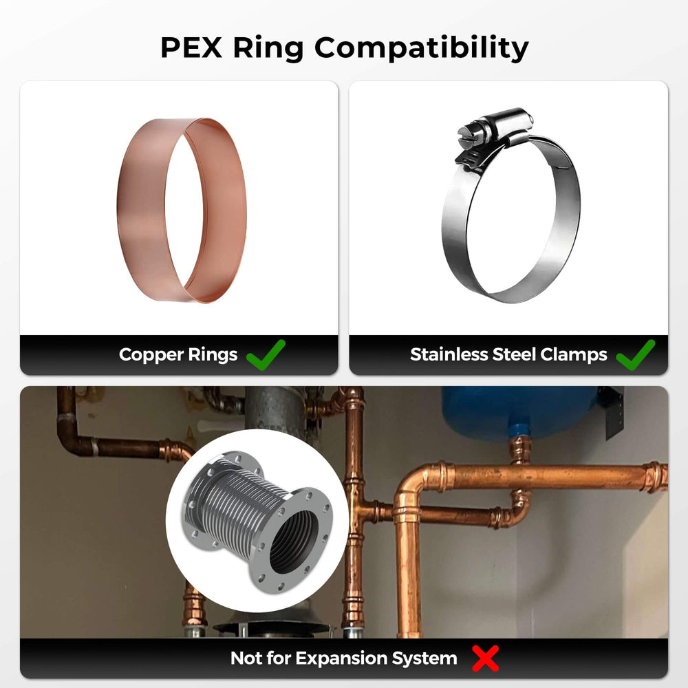 ASTM F1807 Compatible: Works with stainless steel clamp and crimp ring PEX connection methods.